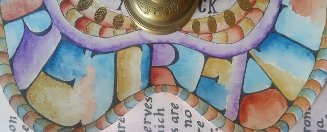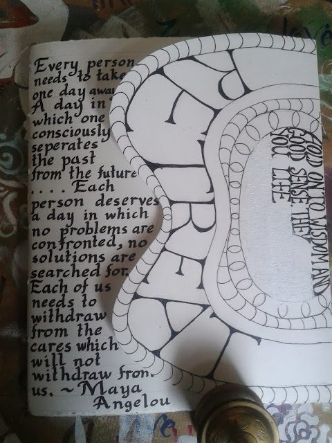 First of all I worked on the flap, I pencilled in the two lines that the word retreat sits between in the photo above, then wrote in the letters as you see. Once I began adding the other lines, above the letters I could see the necklace form take shape and so I drew in those beads as well. I knew which bible verse I wanted to put in there, but it kind of went wrong, as you can see below. But I managed to fix that, which you will see later.